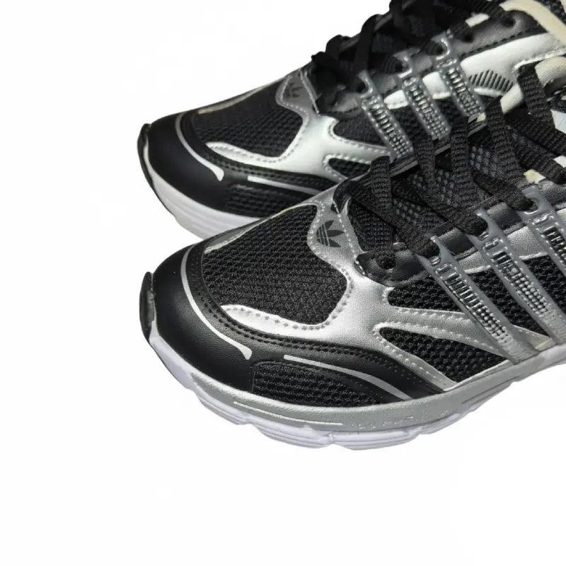 - روکشهای حمایتی (Overlays): پنلهای نقرهای رنگ که احتمالاً از جنس چرم مصنوعی یا مواد سنتتیک براق هستند، برای افزایش استحکام ساختاری (Structural Integrity) و پشتیبانی از پا در حین حرکت. این روکشها از طریق مش عبور کردهاند تا یک قاب حمایتی ایجاد کنند.