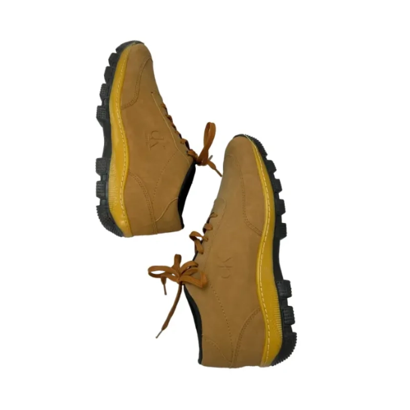 جنس رویه آن، چرم مصنوعی باکیفیت است که ظاهری شبیه به چرم طبیعی دارد اما با قیمتی منطقیتر. زیره ضخیم و آجدار آن با ترکیب رنگ تضاد مشکی و زرد/عسلی، نه تنها زیبایی خاصی به کفش داده، بلکه تضمین میکند که در مسیرهای لغزنده یا ناهموار آسیبی به پا و کمر شما نرسد. بندهای محکم آن به شما امکان میدهد تا فیت و اندازه کفش را دقیقاً مطابق با راحتی پای خود تنظیم کنید.