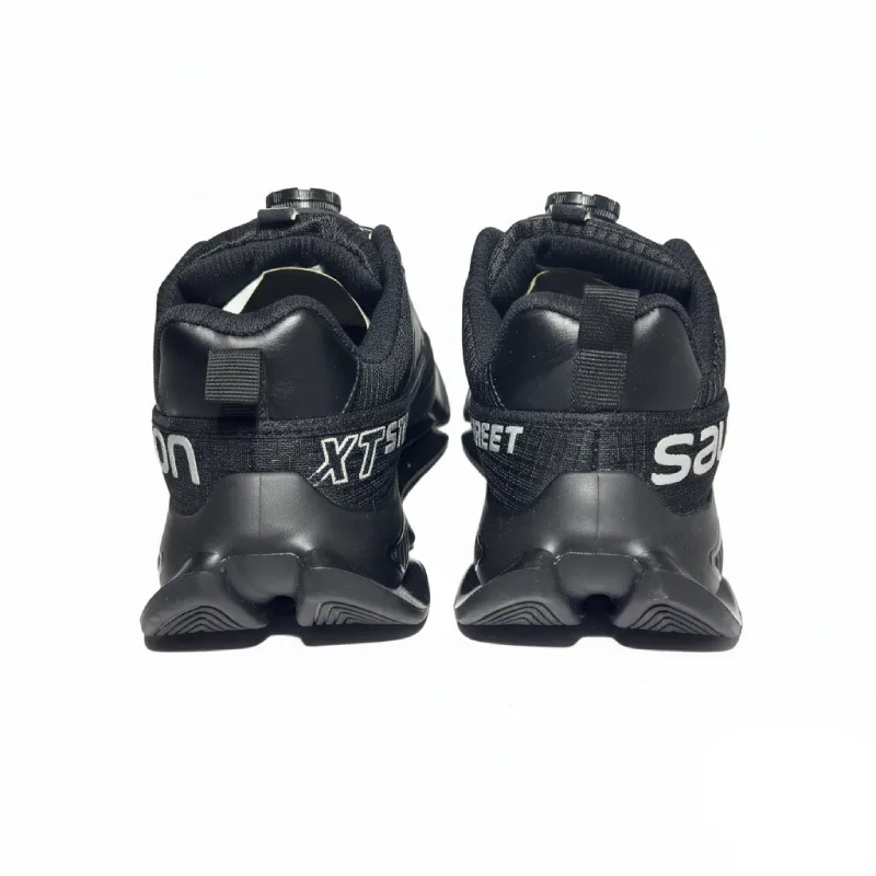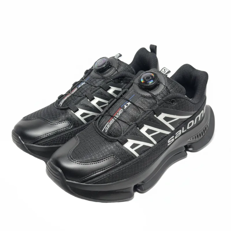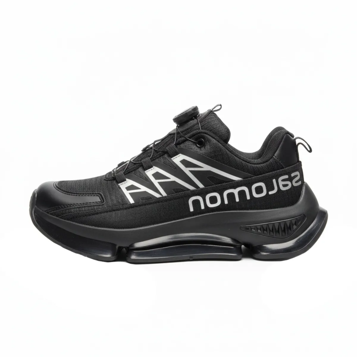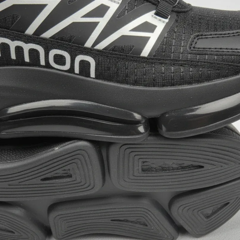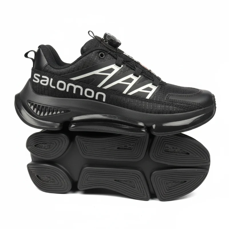 نوشته بزرگ “Salomon” به صورت گرافیکی و کج در کناره کفش به رنگ نقرهای/سفید چاپ شده است.