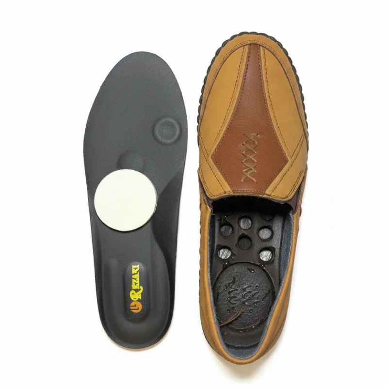 - در قلب کفی این کفش، یک پد فومی یا ژلهای استاندارد تعبیه شده است. این پد به طور هوشمندانه فشار نقطهای و شدید ناشی از خارپاشنه را جذب و خنثی میکند و به شما کمک میکند تا با کاهش چشمگیر درد، ساعتهای طولانیتری بایستید و راه بروید.