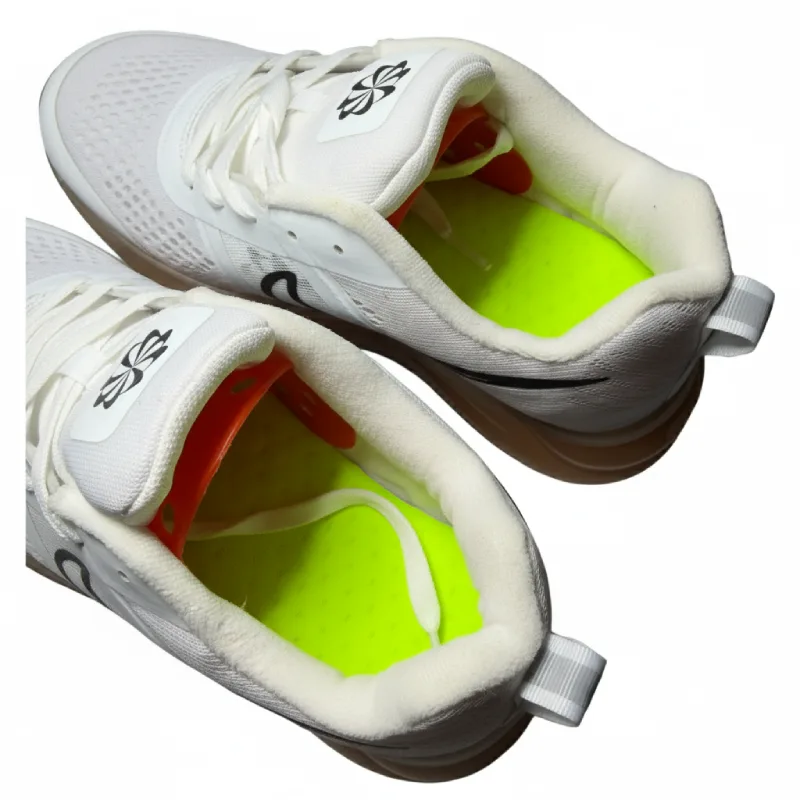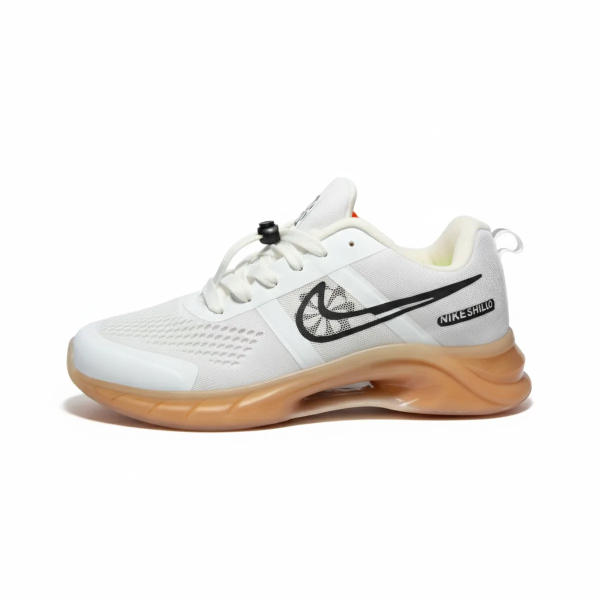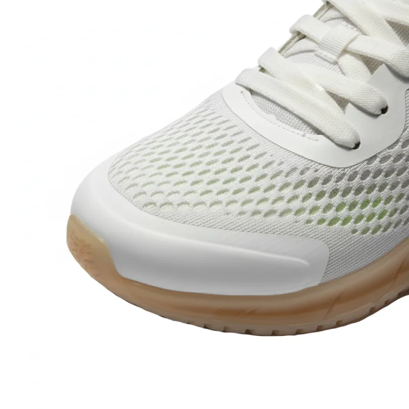 متریال: ترکیبی از توری مشبک (Mesh) سفید/کرم در قسمت پنجه و کنارهها (برای تهویه مناسب) و مواد مصنوعی جیرمانند یا چرم مصنوعی در بخشهایی که نیاز به استحکام بیشتر دارند.