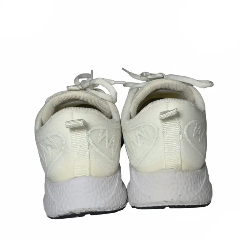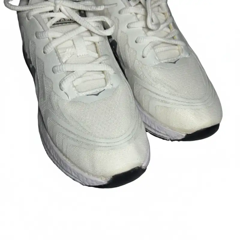 - رویه کفش به رنگ سفید روشن، از جنس مِش (Mesh) تنفسپذیر با کیفیت بالا است که با نوارهای طرحدار (احتمالاً جوش حرارتی یا تقویتکننده TPU) تقویت شده است.