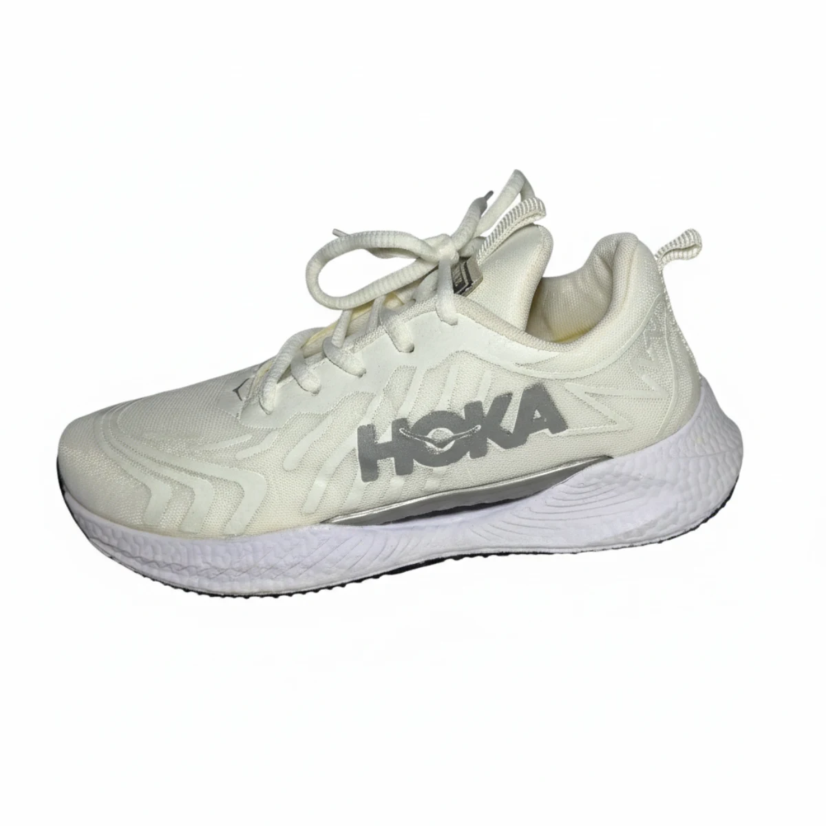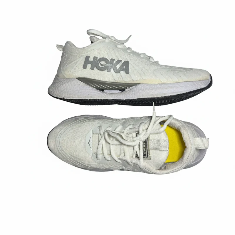 - لوگوی “HOKA” درشت و براق (احتمالاً نقرهای متالیک) در کناره کفش، نشاندهنده اصالت و کیفیت برند است و ظاهری کاملاً بهروز و ترند به کفش میدهد.