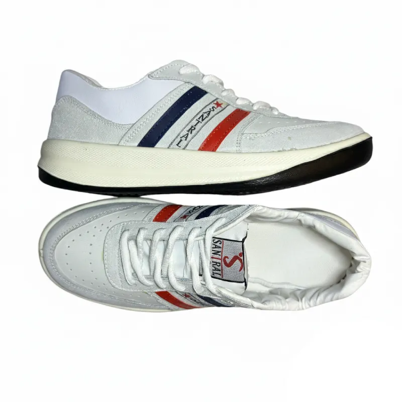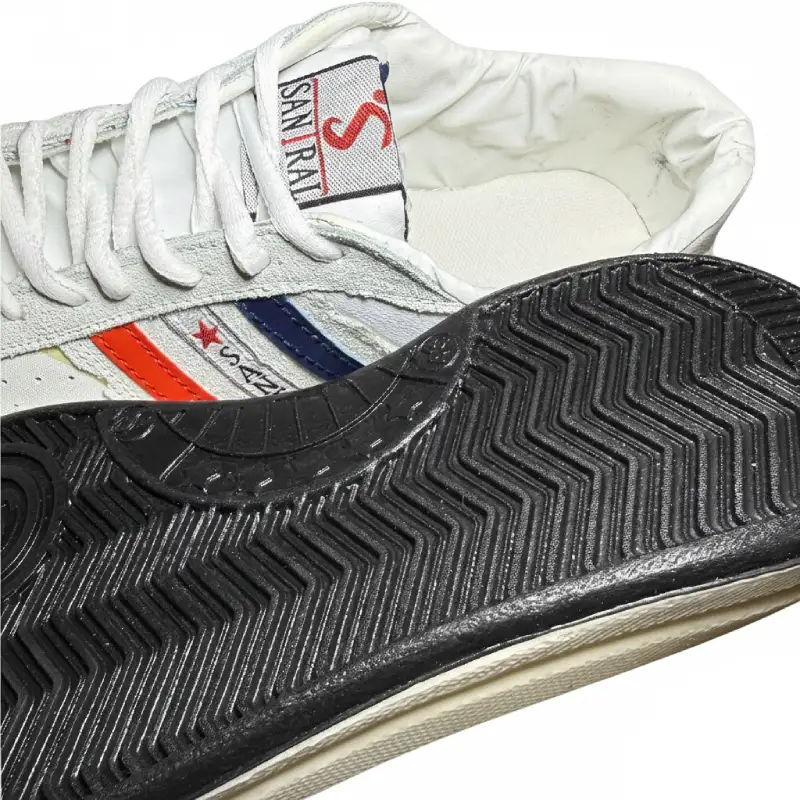 - نوارهای رنگی (قرمز و آبی سرمهای) در کنارهها و لوگوی “SANTRAL” با یک ستاره کوچک، هویت خاصی به این کفش بخشیده و آن را از مدلهای تکرنگ و ساده متمایز میسازد.