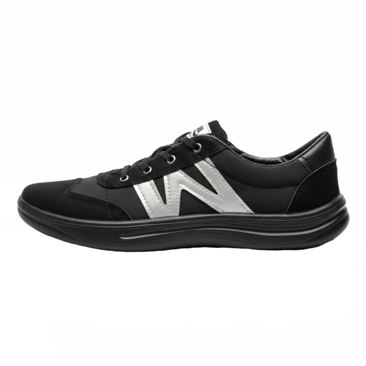 - رویه کفش ترکیبی از مواد با کیفیت، احتمالاً جیر یا نبوک نرم در کنار جزئیات چرمی مصنوعی است. نکته برجسته، لوگوی بزرگ نقرهای/سفید متالیک به شکل حرف “W” یا “M” در کناره کفش است که جلوهای مدرن، جسورانه و متمایز به آن بخشیده است.